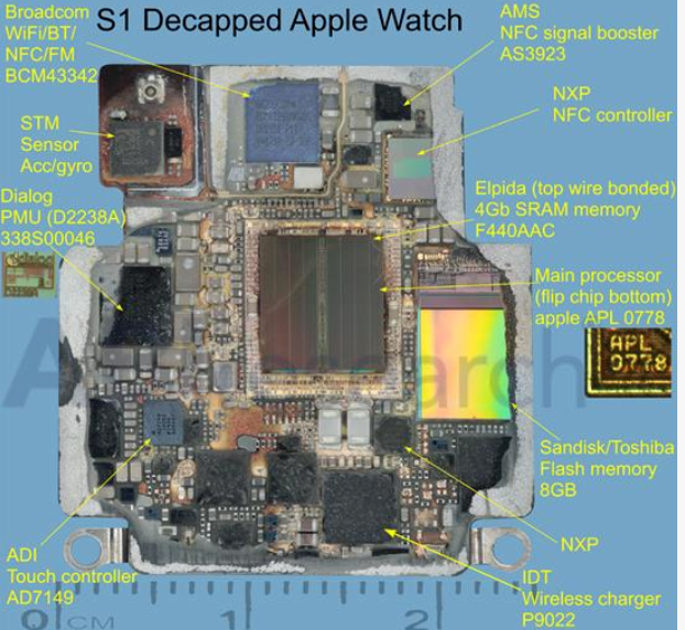 Apple Watch is also equipped with a familiar communication chip - BCM4334, which is used in many Apple products, including Apple TV and iPhone 5. BCM4334 is a dual-band single chip that integrates 802.11a/b/g/n and Bluetooth 4.0. It uses it and Skyworks' wireless network switch and low-noise amplifier to realize WiFi and Bluetooth transmission in Apple Watch.