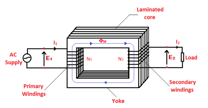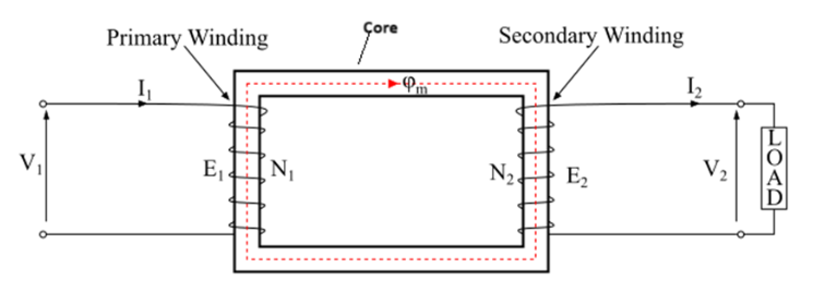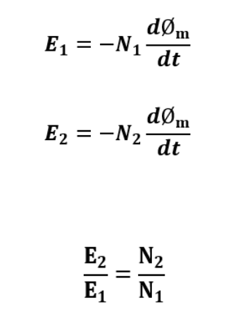 When AC voltage is applied to the primary of the transformer, an AC flux Ø m is generated in the core and produces EME, E 1 . When the secondary coil is inductively coupled to the primary winding through the magnetic flux Ø m, an electromotive force E2 is generated in the secondary winding. EMF E1 is called the primary EMF, and EMF E2 is called the secondary EMF, which is given by the following formula: